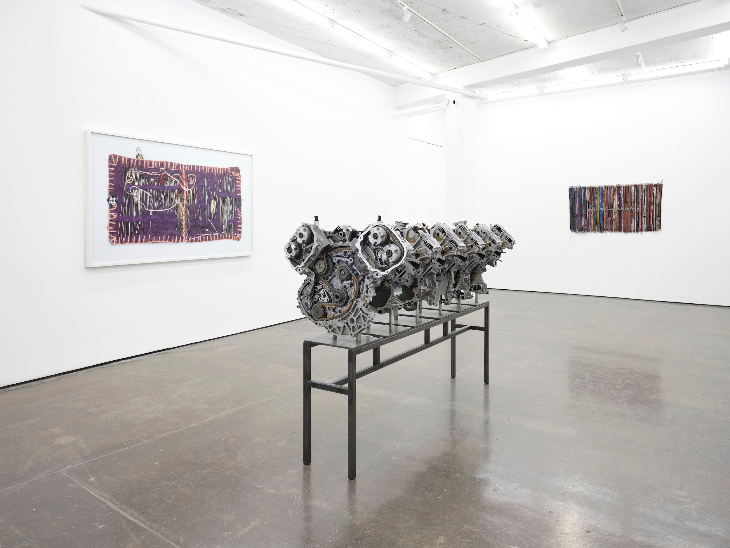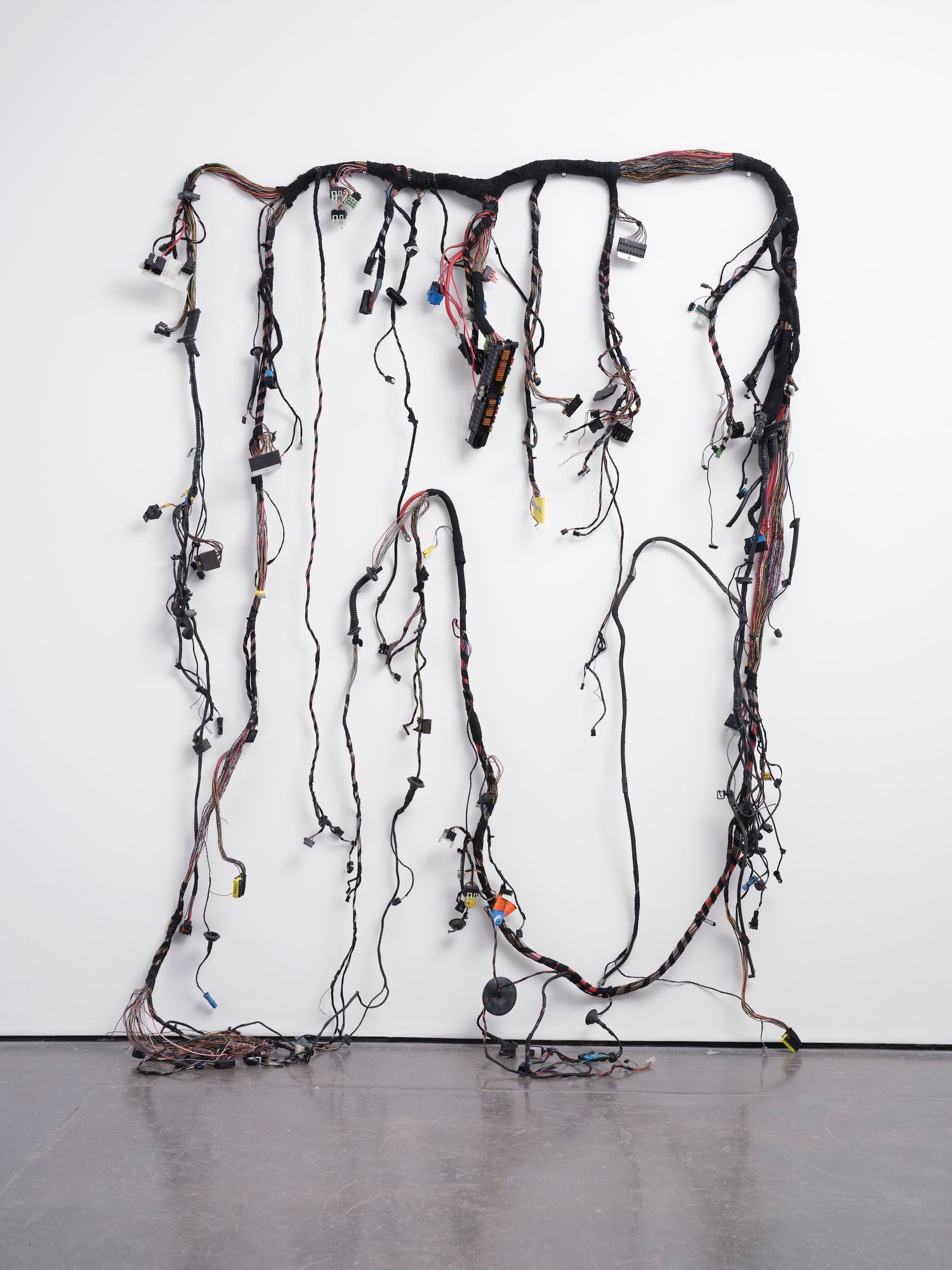 The body seems to be dissolving: a motor can imitate the lever action of the human body, and so our interest is now focused primarily on imitating the brain. But women still have their periods and children are still born from the body cavity. It's a paradox. I'm less interested in the representation of the body right now; less motivation to depict it, at most in resolution. Maybe I’m past the body. The interwoven cable harnesses in the works Autobiography (2024) and Automatic (2024) are witnesses to this dissolution. The complex cable systems, which were the central nervous system responsible for raising and lowering the car windows, moving the windscreen wipers and all the other electronically-controlled functions of a car, have been stripped of their function. The car – understood as a kind of human prosthesis – was their host. A new system is created in the form of a condensed cable fabric, a kind of barcode or part DNA of a machine that no longer functions.