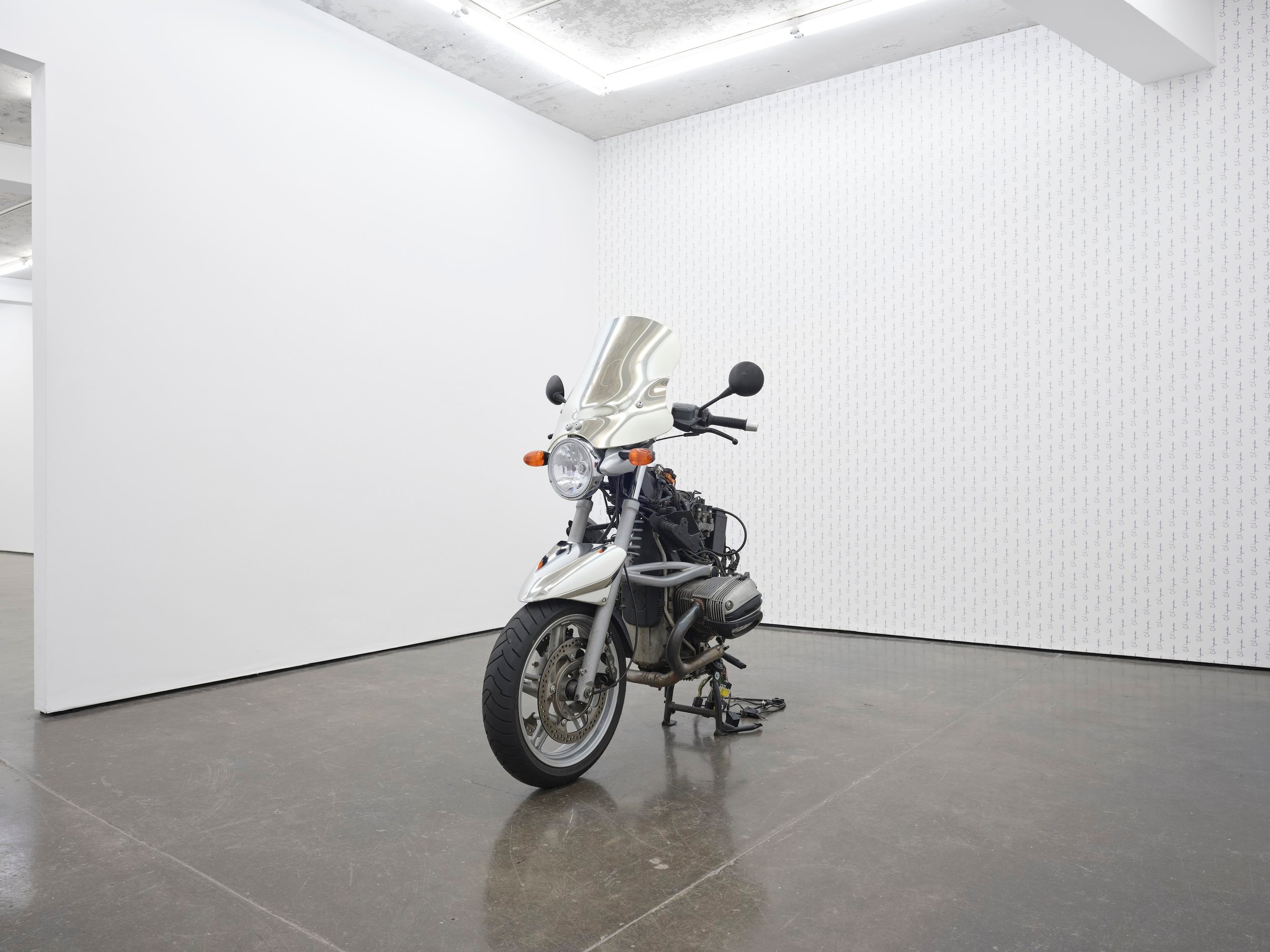 I can control the form of an artwork like the bicycle saddle, but I cannot control the environment which inscribes itself onto the mirrored surface as it travels through the world and is exhibited here and there. The work itself acquires a surreal, almost ephemeral quality and becomes hard to grasp as an object. The mirrored windshield and mudguard are part of a half BMW bike. Usually a see-through component of a generic bike. In its mirrored state it is devoid of its function and acts like a repellent to our glance.