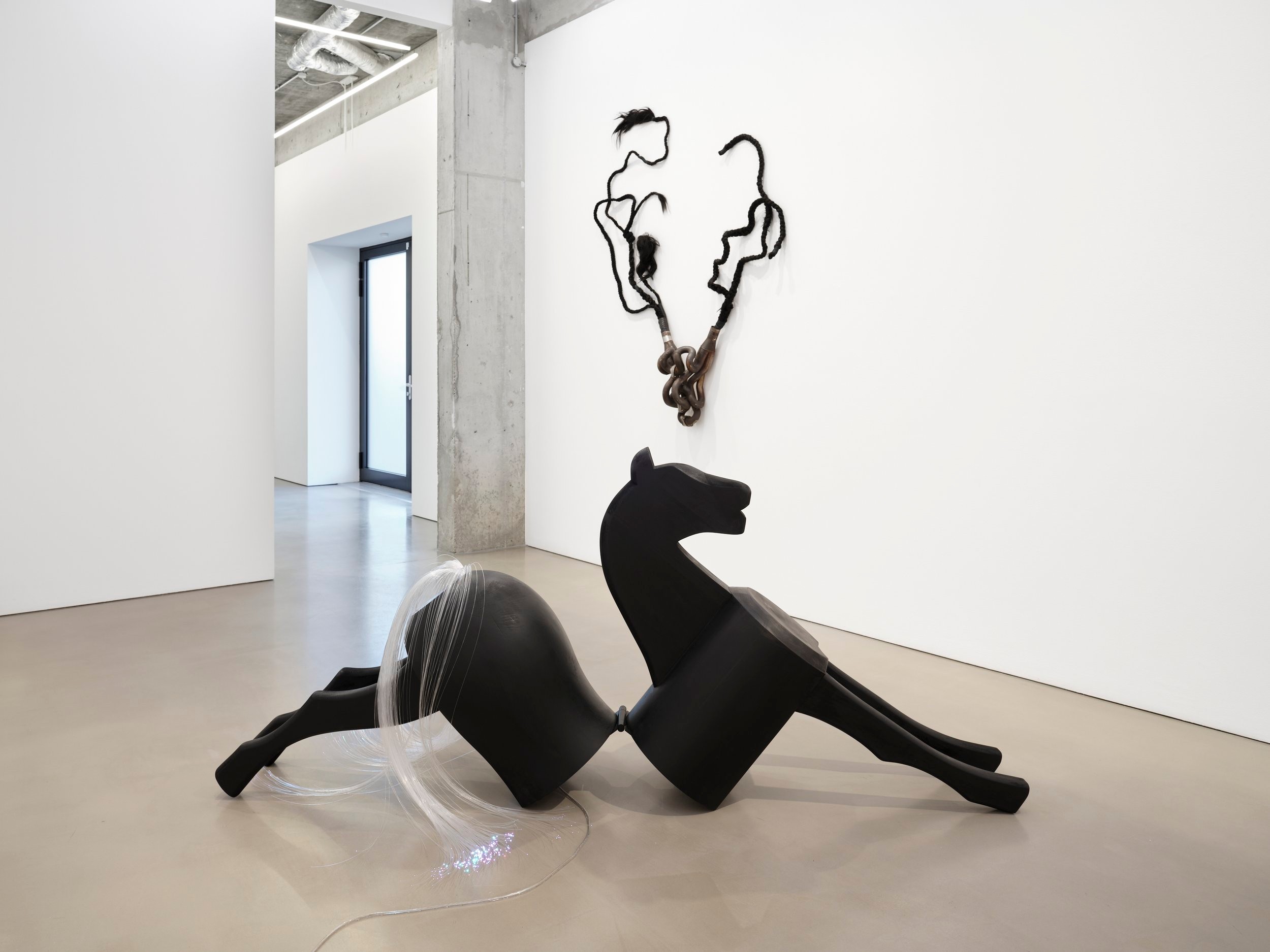 My work Gebrochenes Pferd (Broken Horse) (2024), which will be exhibited at Maureen Paley, is a slightly modified, scaled-down version of the work in Munich. The horse is divided into two parts. A break has taken place, so to speak, and the horse comes to a standstill. This break symbolically takes it out of the power structure and brings it into the nursery. The front and rear parts of the horse are connected with a hinge and offer the possibility of resurrection. In Max Ernst's work, the horse appears again and again in the form of Loplop, whereby the word Loplop – as I called my motorbike swing which I showed at Secession in 2019 – is actually a children's word for gallop, coined by Max Ernst's son. Onomatopoeic.