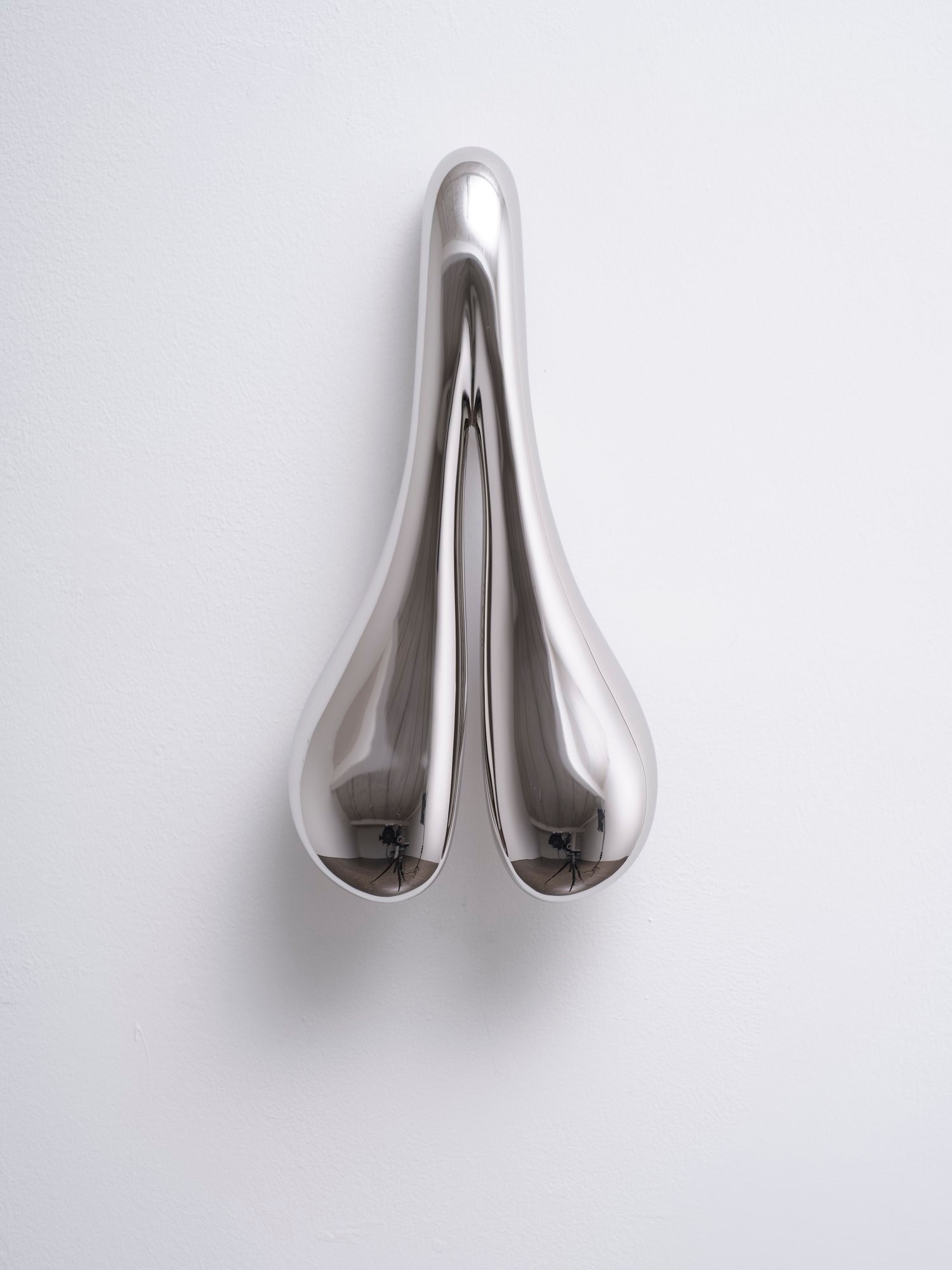 I once saw Leigh Bowery in a London club in the late 80s and was completely mesmerised by his appearance. As well as playing with different identities with extremely elaborate costumes, I was particularly fascinated in his reinvention of body shape and contours. A reimagining of aesthetics. A rewriting of our viewing habits and a reimagining of the concept of beauty. The breaking of many taboos was inherent in his appearances, in the costumes and performances. I think I took something of that with me. Indeed, this relationship between the body, materiality and its construction space is explored in several pieces installed across the two galleries, albeit in less graphic style. This includes a mirror of objects related to the dissected bodies of human prostheses, as you mentioned previously, including a stainless-steel bicycle seat at Maureen Paley and a windscreen and mudguard in chromed finish at Herald St. For me these works push the exhibitions from a sculptural into an environmental format.