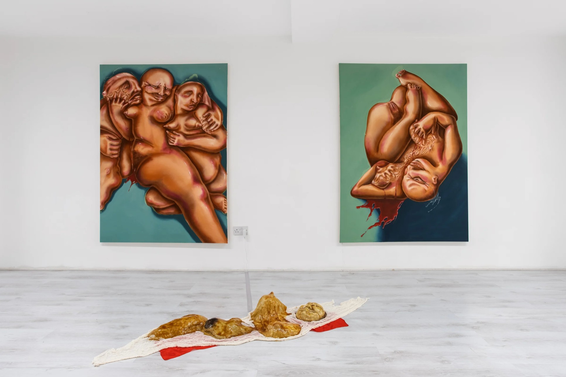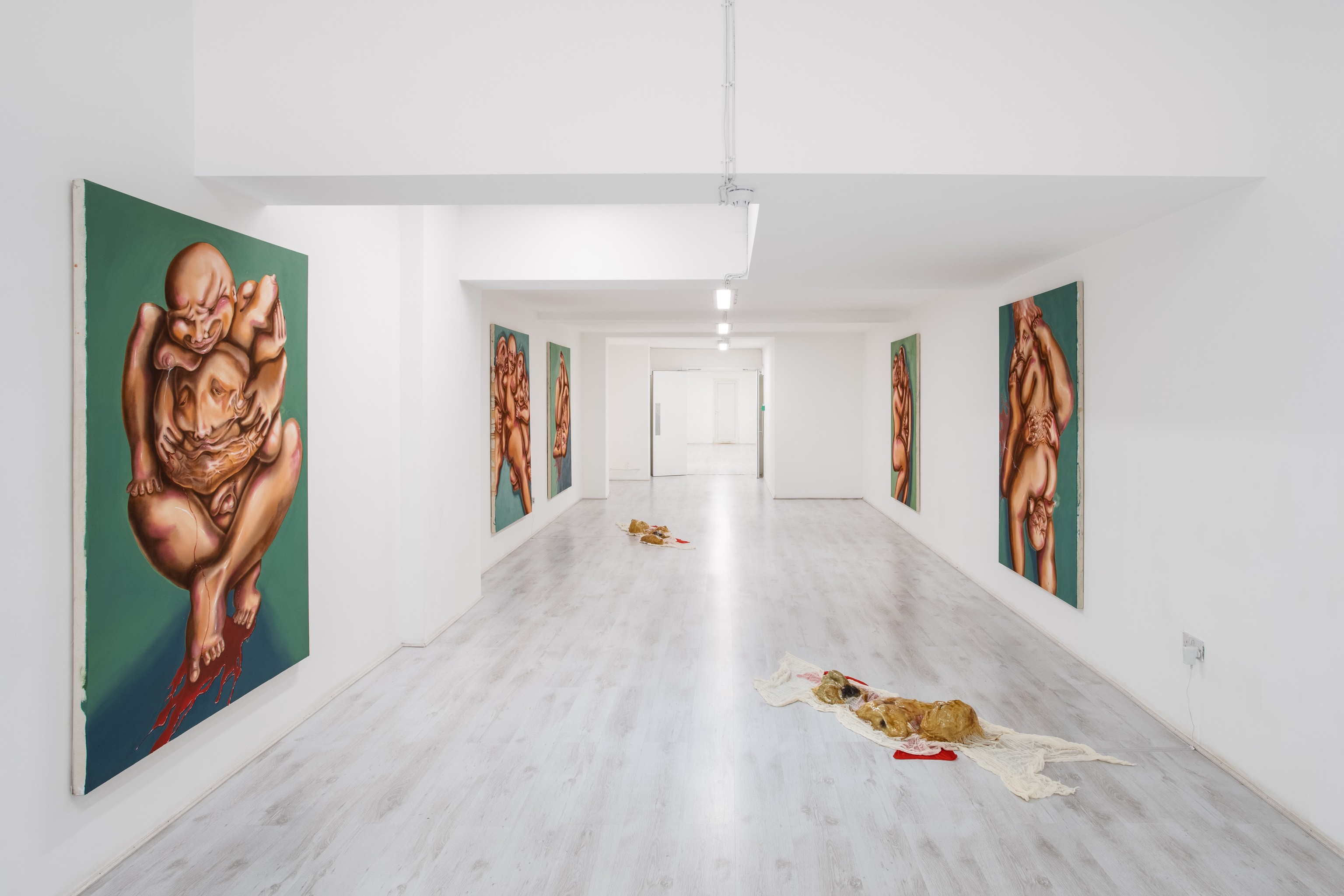 The image of arrested childhood is repeated throughout A Demon in a Sundress, first as bald and glossy textures of skin that stretch and contort across canvas, and second as a series of latex sculptures collapsed lifelessly on the ground – an image of the body turned inside out, of the subject literally abjected, thrown out. Rouy’s figures point to the gap that exists between our imagined and actual body-images, against fascist regimes of the perfect body and the reality of misrecognition that we attempt to fill with entertainment images and fashion models every day and every night of our lives. In either case, it is certainly true that Rouy’s work engages with and excites the politics of the gaze. To be sure, the masculine perspective is subverted. However, it is the feeling that the gaze itself has been problematised, made obscene or obliterated, that is paramount; as if the abject were weaponised or given agency over us, looking back at us through the work. In the words of Hal Foster, the abject reveals itself here 'as if there were no scene to stage it, no frame of representation to contain it, no screen.'